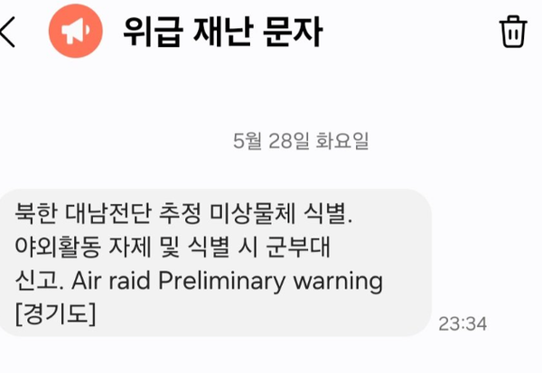 지난 28일, 북한이 살포한 대남전단(삐라)으로 추정되는 물체가 발견돼 한밤중에 위급재난문자가 발송되는 일이 있었습니다. 경기도에서 지난 28일 오후 11시 35분쯤 '북한 대남전단 추정 미상물체 식별. 야외활동 자제 및 식별 시 군부대 신고'라는 내용의 재난문자를 시민들에게 전파해 많은이들을 놀라게했습니다. 합동참모본부가 북한 대남전단으로 추정되는 미상 물체가 경기, 강원 접적지역 일대에서 식별돼 군에서 조치중에 있다고 밝인 데 따른 조치였습니다.