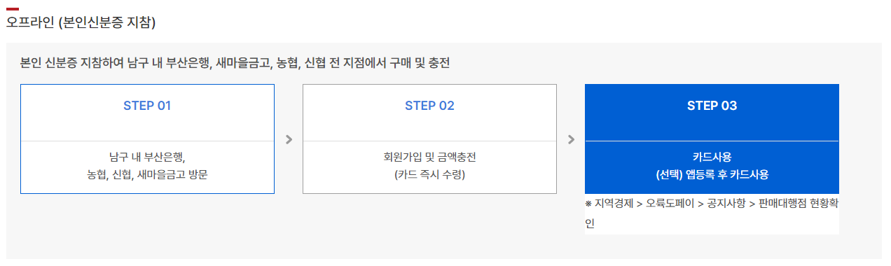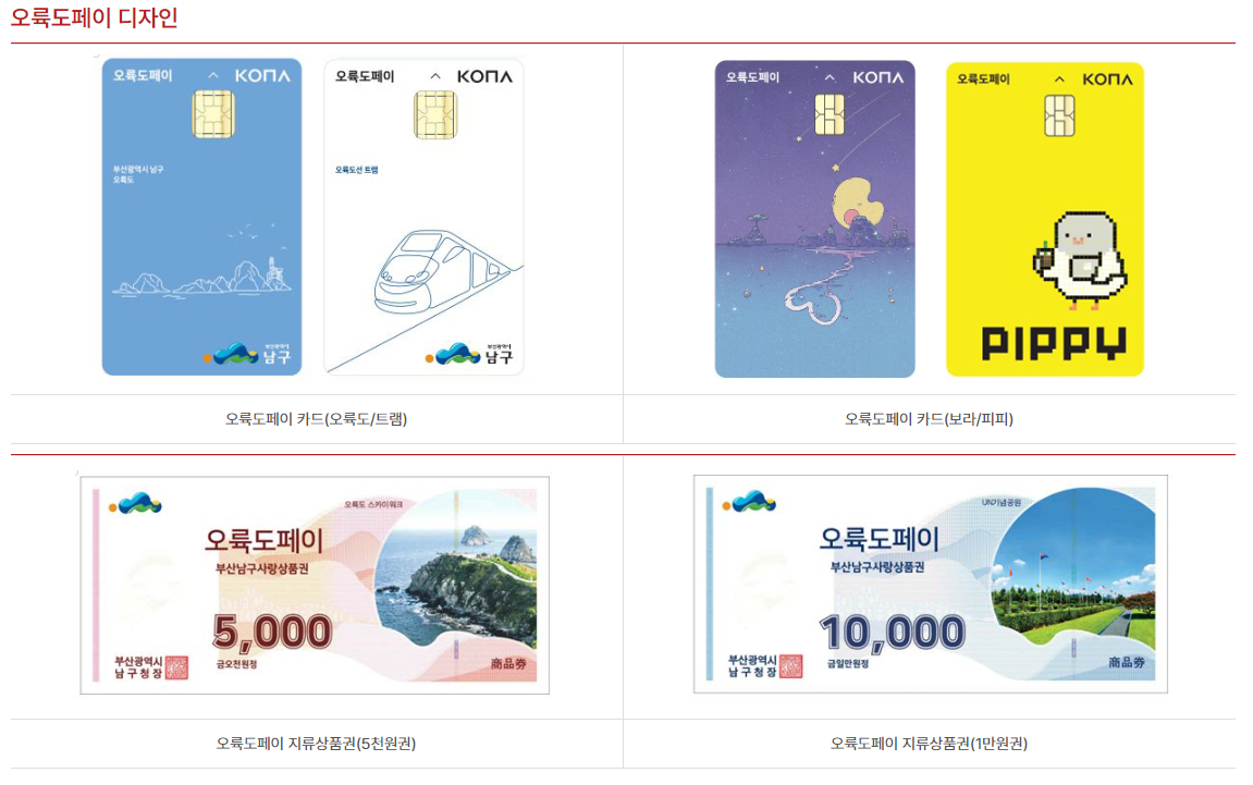 부산남구사랑 상품권 '오륙도페이'는 지역 자금의 유출을 막고 지역 내 소비를 촉진시켜 골목상권을 보호하고, 남구 경제를 활성화하고자 부산광역시 남구가 발행하는 지역사랑상품권 입니다. 오륙도페이는 부산 남구에서 등록된 가맹점에서만 사용이 가능하지만 대부분의 가게들이 등록되어있어 편하게 사용하실 수 있습니다.